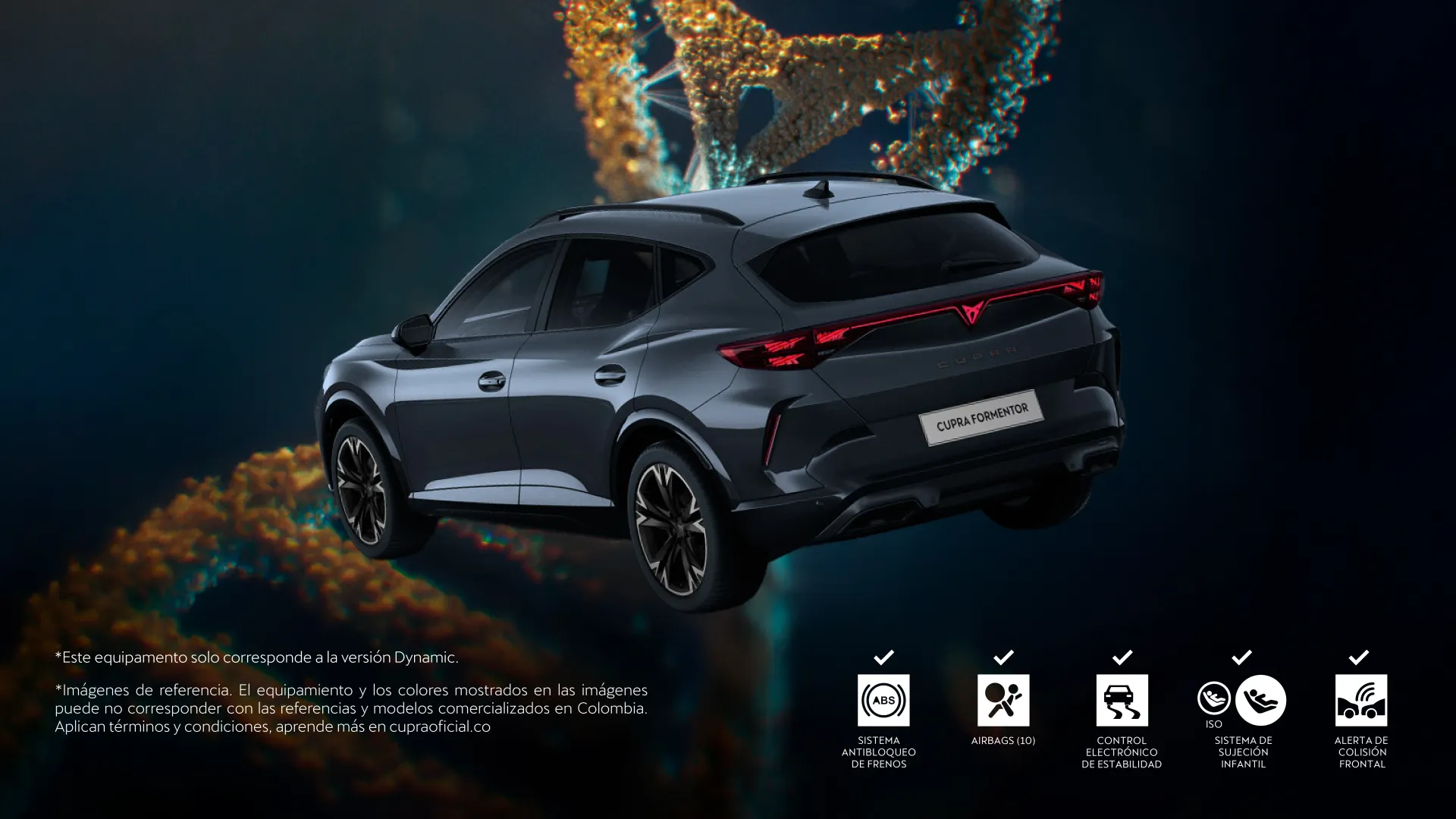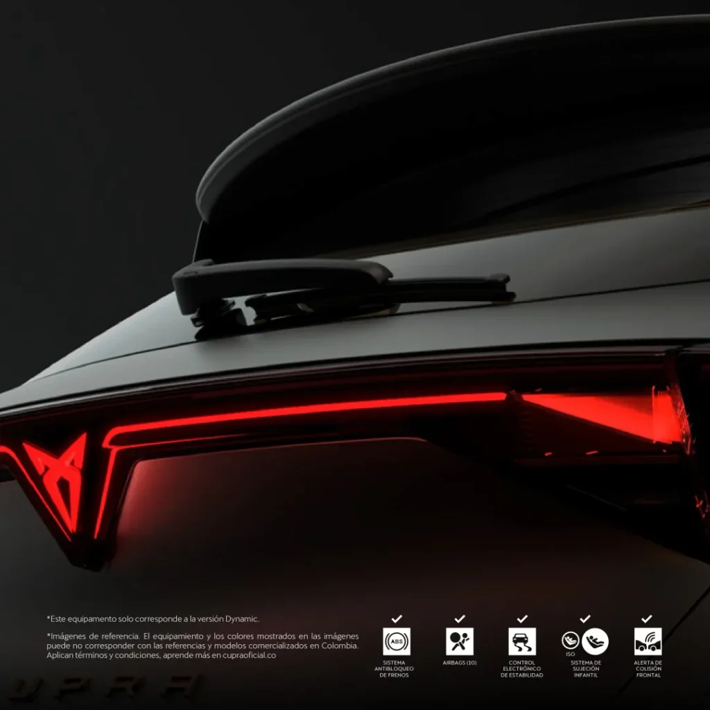 *Imágenes de referencia. Los equipamientos, accesorios y/o colores hacen parte de la ambientación fotográfica o pueden no corresponder con las referencias y modelos comercializados en Colombia o no constituir una referencia exacta del vehículo ofrecido en la red autorizada de concesionarios. Consultar ficha técnica disponible en cupraofficial.co. Oferta válida financiando únicamente con los aliados de Porsche Movilidad Colombia S.A.S. (en adelante “Porsche Movilidad”). Aplica directamente en la red autorizada de concesionarios CUPRA a nivel nacional.