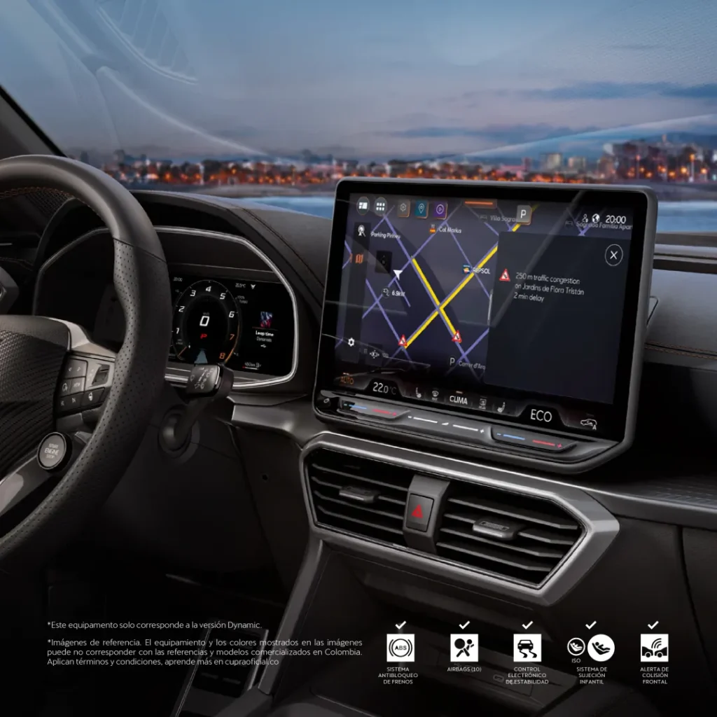 El CUPRA Formentor Drive combina deportividad y eficiencia con su motor 1.5 eTSI de 150 hp y tecnología híbrida ligera (MHEV). Equipa rines de 18" en gris titanio, conectividad inalámbrica con Apple CarPlay y Android Auto, cargador inalámbrico y control de crucero. Su interior cuenta con una pantalla táctil de 12.9", cámara de reversa y climatizador de 3 zonas. En seguridad, ofrece 6 airbags, frenos ABS, anclajes ISOFIX y control de estabilidad (ESC).