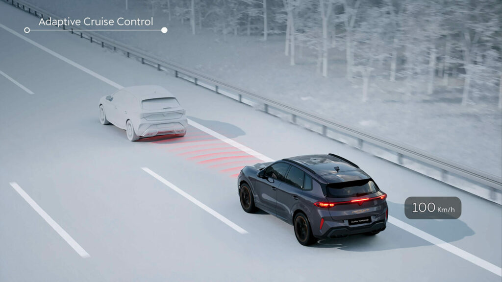 El Nuevo CUPRA Terramar equipa asistentes como el Control Crucero Adaptativo (ACC), que regula la velocidad según el tráfico, y el asistente de frenado de emergencia con pre-crash que anticipa riesgos en la vía, además de monitoreo de fatiga y distracción del conductor. Un conjunto de tecnologías que convierte cada trayecto en una experiencia más segura y precisa.