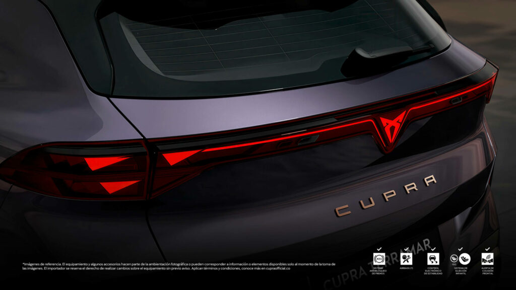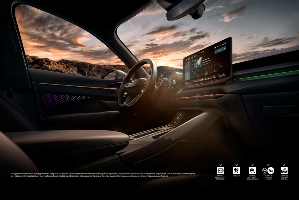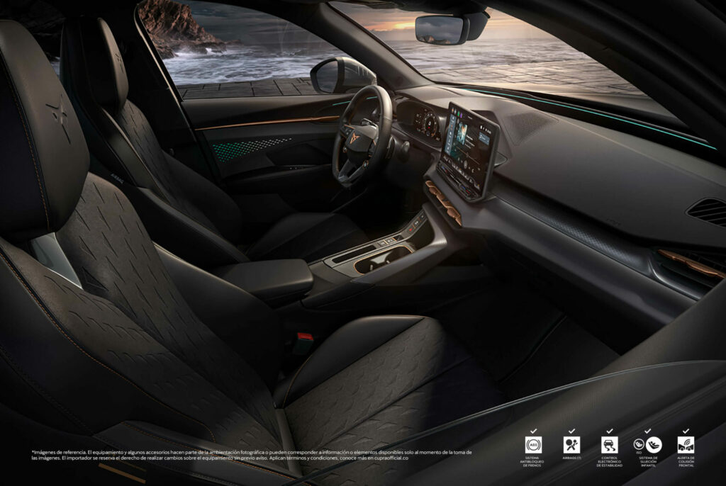 Imágenes de referencia. El equipamiento y algunos accesorios hacen parte de la ambientación fotográfica o pueden corresponder a información o elementos disponibles. Sólo al momento de la toma de las imágenes. El importador se reserva el derecho a realizar cambios sobre el equipamiento sin previo aviso. Los vehículos se encuentran en tránsito y deben surtir trámites ante autoridades, cuyos procesos no tienen plazos estrictos, establecidos, lo que puede retrasar la fecha de entrega de los vehículos. Aplican términos y condiciones conoce más cupraofficial.co