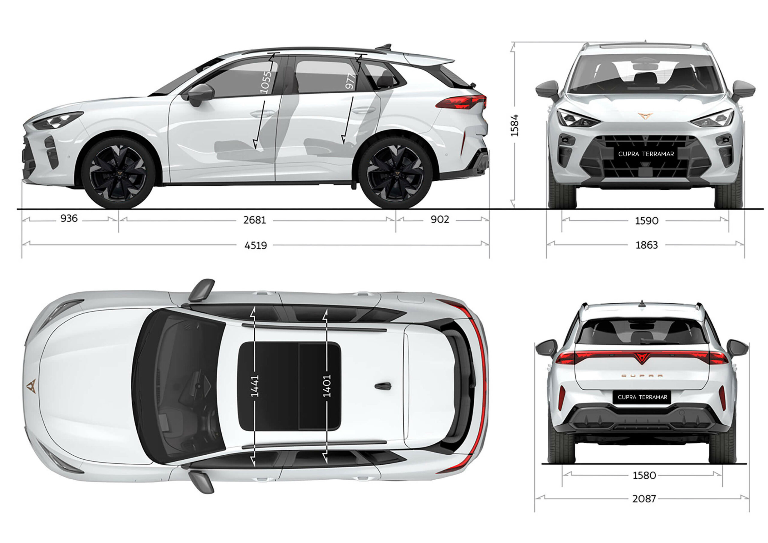 Los rines bitono de 19” Spectrum acentúan la silueta deportiva del Nuevo CUPRA Terramar. Su diseño refuerza el carácter del modelo y se combina con tecnologías como la dirección dinámica y el control de tracción, que transforman cada movimiento en pura precisión.